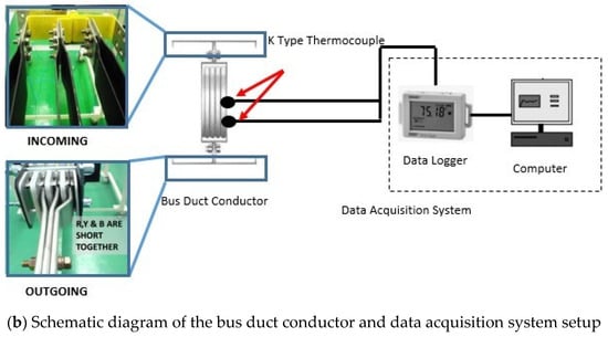 (a) Experimental setup with the surrounding air temperature measured with a K-Type thermocouple 1 m from the casing (b) Schematic diagram of the bus duct conductor and setup.