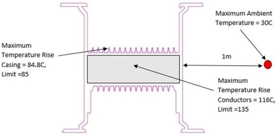 To ensure accuracy and robustness in any numerical investigation, the simulation setup must be validated using experimental data. Validation typically entails carrying out lab experiments while adhering to exact relevant standards related to the application of interest. The boundary conditions of the numerical model must be as close to those of the experimental setup as possible (Figure 5). Performance indicators between the numerical and experimental setups should differ as little as possible, with an average error of less than 10% [43]. The temperature at the end of the thermal heat sink served as the study’s main performance indicator. The temperature was measured using K-type thermocouples. Each bus duct conductor component’s temperature rise is shown in Figure 6. The casing’s highest recorded temperature was 84.8 °C.