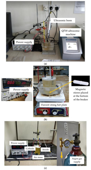 Three dispersion methods on the AgNP nanoparticle were considered in the current study. The coating parameters of AgNP on the Sn plate were set for all methods (ultrasonic agitation, magnetic stirring, and argon gas agitation). The experimental setup for each dispersion method is shown in Figure 7. Table 4 summarizes the parameters used in the experiments. The AgNP used in this study was nano-sized (10 nm and 100 nm).