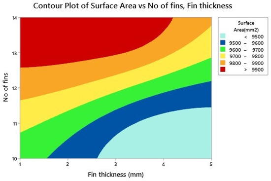 Contour Plot of Surface Area vs. No of fins, Fin thickness.
