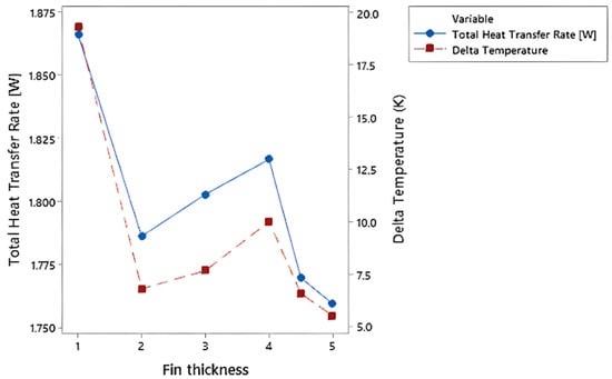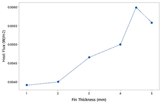 The absolute thermal resistance of a single fin decreased as fin thickness increased (Figure 11), as the temperature difference between the fin’s base and tip increased (Figure 12). As a result, the heat flux increased from the base to the tip of each fin (Figure 13). The formulae of Equations (16) and (17) were used to calculate the thermal resistance and heat flux at the fin base.