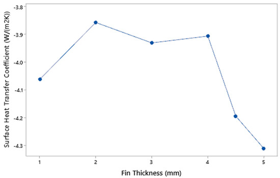 Better convective heat transfer is indicated by a higher Nusselt number. The Nusselt number in this study ranged from 15.2 to 17.5. The highest Nu was produced by the 1 mm fin thickness (17.5). A higher Nu is found in thinner fins than thicker fins (Figure 14). This can be explained by the fact that thinner fins have a higher average convective heat transfer coefficient (Figure 15).