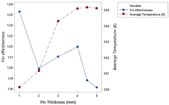The efficiency of the fins is increased by using this material’s high thermal conductivity, and the P/A ratio and convective heat coefficient should be low. Fin effectiveness must fall between 0 and 1. Fin applications with values between 0.9 and 0.95 are the most effective. When designing a thermal fin, fin effectiveness and efficiency are two important design considerations [35]. Designers need to look into the best possible design to balance these factors.