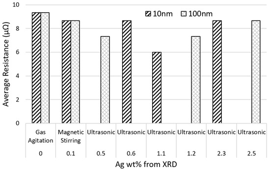 The presence of Argentum (Ag) on the Sn-plated copper substrate demonstrated that nanoparticles of AgNP were successfully coated on the substrate surface. Table 6 summarizes the Ag wt% and average resistance for the coating experiments with different dispersion methods. The ultrasonic agitation method shows a higher Ag for cases 3–8. The increase in nanoparticle volume (from 1 mL to 3 mL) raises the Ag percentage. However, the size of the nanoparticles slightly influenced the Ag percentage when a similar volume was used in the experiment. In contrast, using a magnetic stirring method, the Ag percentage yielded a meager Ag percentage detected in the X-ray diffraction (XRD) results. The Ag percentage was not detected on the substrate surface when using argon gas agitation. In addition, the ultrasonic agitation-coated substrates have a lower average resistance than the gas agitation method. This result indicated that Ag’s presence reduces the copper substrate’s electrical resistance, reducing heat resistance [44,45]. The average resistance versus the weighted percentage of AgNP is plotted in Figure 20. Electrical resistance corresponds to thermal resistance. Thermal resistance is the ability of a material or object to resist the flow of heat and a temperature difference measurement. This property is crucial for the heat sink to ensure excellent heat dissipation and control the temperature of electrical and electronic devices. Higher thermal resistance blocked the heat flow through the metal, resulting in poor heat dissipation. Lower resistance is preferable to allow the heat to flow easily and dissipate from the heat source. Thus, the lowest average resistance was achieved using 2 mL 10 nm AgNP in the ultrasonic agitation coating process. A similar ultrasonic agitation process with 2 mL 10 nm AgNP was repeated in another 30 samples. The average resistance is 8.8 μΩ.