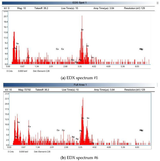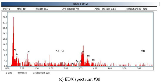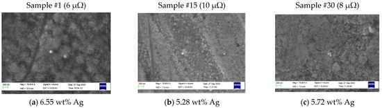 Some etching methods trials have revealed the distribution of the Ag dispersion (Figure 21). Elemental analysis can be performed on regions as small as a few nanometers when EDXA and electron microscopes are used together. The effect of the electron beam on the surface and its penetration into the particle’s depth produces X-rays which are defining features of the elements on and near the sample’s surface [46]. The EDX area scanning showed the presence of Ag in the area shown in samples #1 to #30. The EDX spectra of selected samples #1, #6, and #30 are shown in Figure 22. However, the Ag distribution is not visible because the Ag was embedded within the Sn matrix (Figure 21a–c). In addition, the 3D atomic force microscopy (AFM) topography evaluated the average roughness (Ra), and root means square (RMS) roughness of the coated sample (Figure 21d–f). A long ridge along the middle of Sample #15 may contribute to a high contact resistance value (10 μΩ) because the gap reduces the active contact area for current flow.