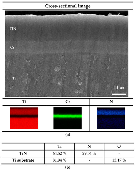 Cross-sectional images of TiN-coated specimen and EDS results (wt%). (a) Cross-sectional image of TiN-coated specimen; (b) EDS analysis of TiN coating.