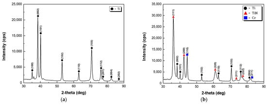 A cross-section image of the TiN-coated specimen is shown in Figure 2. The thickness of the coating layer ranged from 2.5 to 3 μm. It was confirmed that the Ti, Cr buffer layer, and TiN coating layer were composed of dense microstructures. The Cr buffer layer was deposited using sputtering to improve the adhesion of TiN. EDS analysis showed that Ti = 81.94 wt% and O = 13.17 wt% for the titanium substrate, and Ti = 64.52 wt% and N = 29.54 wt% for the TiN coating layer. Figure 3 shows the results of the XRD diffraction patterns for the TiN coating layer. In the case of the Ti substrate in Figure 3a, diffraction peaks of α-titanium were observed on the (100), (002), (102), (110), (103), and (112) planes [17,18]. As a result of the TiN coating layer analysis shown in Figure 3b, the Ti, Cr, and TiN diffraction peaks were measured. TiN presented strong diffraction peaks on the (111), (200), (220), (311), and (222) planes, indicating that a stable phase was formed [19]. In the face-centered cubic (FCC) structure, the (200) and (111) planes have the lowest surface energy and strain energy, respectively. It can be interpreted that the total free energy decreases as the coating layer grows along the (111) plane when the strain energy is dominant [20].
