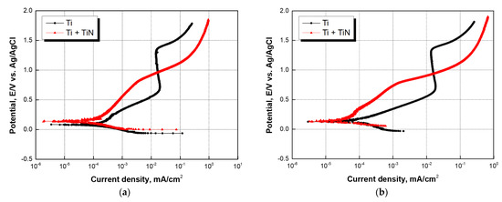 Potentiodynamic polarization curves of titanium substrate and TiN-coated specimen in simulated PEMFC environment; (a) Cathode (air bubbling); (b) Anode (H2 bubbling).