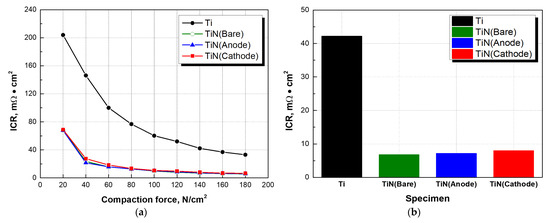 Interfacial contact resistance of titanium substrate and TiN-coated specimen. (a) at various compressive force; (b) at 140 N/cm2.