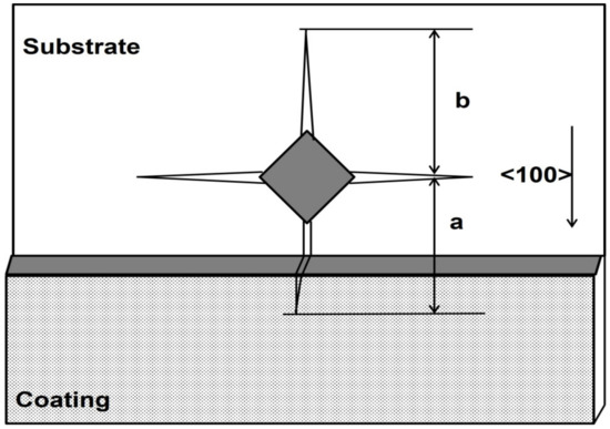 where KS is Si substrate toughness, a and b are the lengths of indentation cracks growing into and away from the coating, respectively, ϕ is the slope of a versus b, t is coating thickness, σr is residual stress, is the effective elastic modulus given by Ec,s/(1 − ), and subscript c and s describe the coating and substrate, respectively, and ν is the Poisson ratio. The + and − signs are for tensile and compressive residual stresses, respectively.