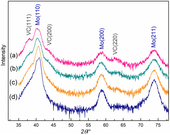 GIXRD spectra of Mo/VC multilayers: (a) ηMo/VC = 6:4, (b) ηMo/VC = 7:3, (c) ηMo/VC = 8:2, (d) ηMo/VC = 9:1.