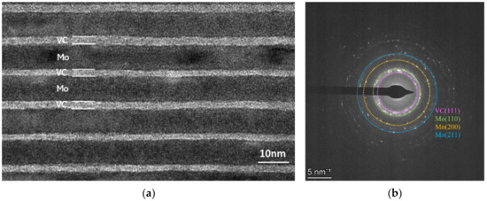 The bright-field cross-sectional TEM micrograph of Mo/VC multilayers with modulation ratios ηMo/VC = 8:2 is displayed in Figure 3a. The multilayers, showing a dense columnar structure, disclosed alternating bright (VC) and dark (Mo) layers in a growth direction. The average thickness of the Mo layer is 7.8 nm, while that of the VC layer is 2.2 nm, consistent with the controlled value. The corresponding electron diffraction pattern of the cross-section sample is shown in Figure 3b. Mo and VC reflections are clearly visible, which matches the typical bcc and fcc (B1) polycrystalline structures, respectively. The lattice spacing of Mo was 0.315 nm and the VC was 0.418 nm, supporting the GIXRD results.