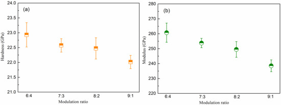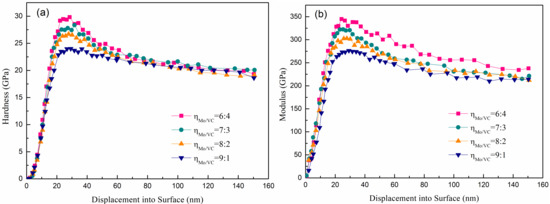 Figure 4a,b depict the variation in hardness (H) and elastic modulus (E) as a function of displacement for Mo/VC multilayers with different modulation ratios, respectively. One can see that plateaus occur for the hardness curves in the displacement range from 60–90 nm, which is a 10%–15% coating thickness (600 nm), and is assumed to be the coating hardness with negligible substrate effects, as well as the modulus curves. When the displacement goes beyond 90 nm, the hardness and modulus begin to reduce due to substrate effects.