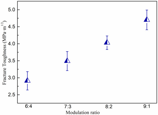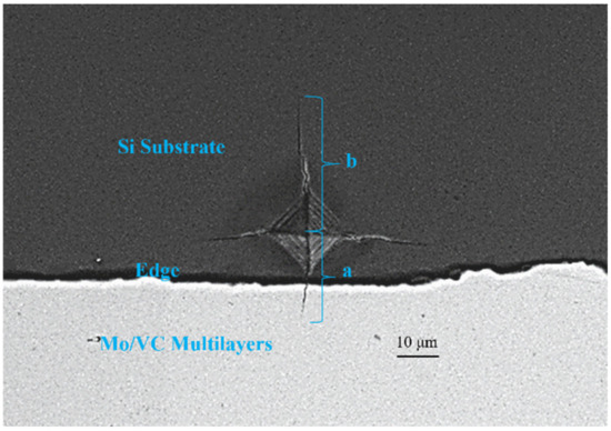 Figure 6 shows the toughness of Mo/VC multilayers determined by the microindentation method. It was noted that as toughness for Mo/VC multilayers increased by 62% from 2.91 to 4.70 MPa·m1/2 with modulation ratios varying from 6:4 to 9:1, the hardness (in Figure 5) is almost sustained, with only 6% reduced. The trade-off between hardness and toughness was apparent, although the mechanical properties of Mo/VC multilayers have not reached the high level of biomaterial properties. This result is due to a combination of several factors, such as the nano-scale grain size [28], the different modulus between the two neighboring layers [29], and interfaces [30,31,32,33,34,35]. Particularly, coherent interfaces not only improve the hardness of the multilayers by alternating the stress field acting as obstacles slipping, but also enhance the toughness by coherency stress activating the dislocation motion near the interfaces. In general, heterogeneous fcc/bcc coherent interfaces produce higher drag force to block the threading dislocation migration compared with a coherent interface with same crystal structure [36]. It is possible for coherent interfaces to absorb or accommodate dislocations due to stress induction, which also mediates dislocations across the interfaces, thus the multilayer toughness improves [30]. Figure 7 shows the indentation with crack pattern, while Table 2 lists the parameters required for toughness calculation.