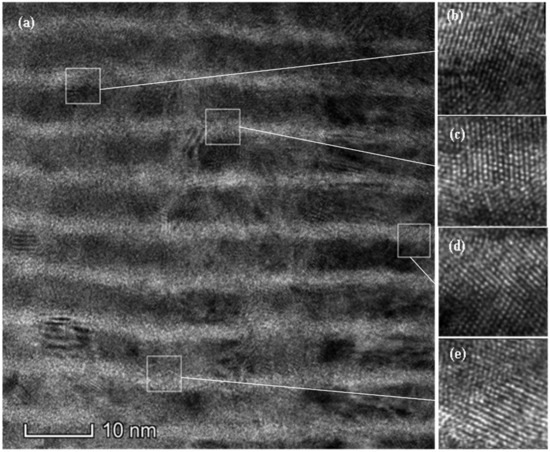 (a) High-resolution TEM image of Mo/VC multilayers with ƞMo/VC = 8:2, (b–e) Coherent interfaces details.