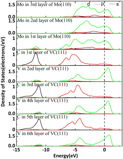 Because the C-terminated hollow-site interface has the strongest adhesion, the partial density of states (PDOS) has been calculated to further comprehend the bonding nature of the Mo(110)/VC(111) interface. The plots are displayed in Figure 10. The PDOS curves of the interfacial layers are significantly different from the interior layers. The interfacial Mo layer in Mo(110) shows new peaks around −5, −6.5, and −11.7 eV, which are resonant with the peaks of the interfacial C layer and the second V layer in VC(111). These resonant peaks are caused by the hybridization between the interfacial C-s orbits, C-p orbits and Mo-d orbits. Moreover, the height of the PDOS curve for the interfacial Mo layer is lower than that of the interior atoms. This indicates the strong Mo-C interfacial interaction and the formation of the strong Mo-C covalent bonds.