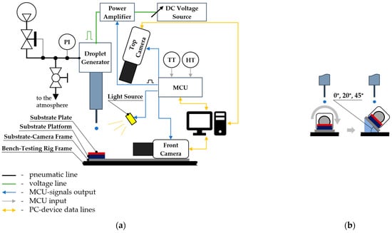 The testing rig (Figure 1a) includes a droplet generator unit described further in Section 2.2, a substrate plate as explained in Section 2.3, a microcontroller unit (MCU, Arduino UNO R3, Tokyo, Japan), a light source (Veritas, Pasadena, CA, USA), two high speed cameras: a front camera (Photron Mini UX100, Tokyo, Japan) and a top camera (Baumer VLXT-17M.I, Southington, CT, USA), and a desktop PC (HP Z240 with 64 GB of RAM), mounted on a bench-testing rig frame.