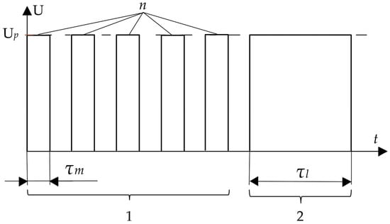 Figure 2. Impulse series parameters: 1–setting the required droplet volume; 2–dropping.- Piezoelectric voltage (Up), which is controlled by the DC voltage source in a range of 0–200 V.