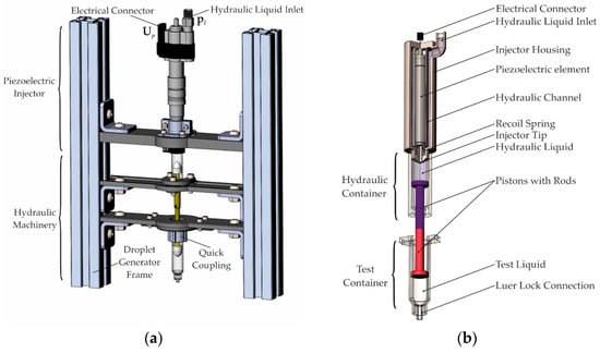 Droplet generator unit (a) mounted on the tower, assembly view; (b) cut-section showing the piezoelectric injector, the hydraulic container, and the test container.