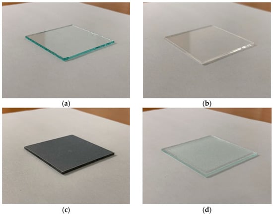 Figure 4. Substrate samples: (a) glass; (b) acrylic glass; (c) aluminum with hydrophobic coating; (d) rough glass. - Acrylic glass (polymethylmethacrylate) offered the best transparency with low resistance to some chemical components of the suspensions, such as heptanol-1 (Figure 4b). Preparation was carried out on a laser cutting machine.