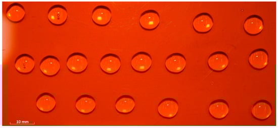 The repeatability of large droplets was estimated at constant generator parameters. A series of 20 droplets were generated. The equivalent stain diameter for each droplet was calculated according to the stain area of the corresponding droplet. The droplet stain area was retrieved from the calibrated drop repeatability test image (Figure 5). Stain diameters were 8.26 ± 0.41 mm, such that the min-max range of the droplet sizes was ±5.0%.
