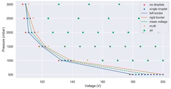 A pressure-voltage parametric map (Figure 6) was obtained with the remaining control parameters of the droplet generator, unchanged, and an electric single pulse mode with the duration (τl) of 4.0 ms was used. A 0.33 mm diameter needle mounted on the Luer Lock connector was used.