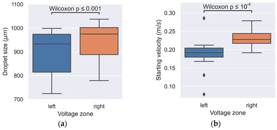 The statistical Shapiro tests suggested that droplet sizes and pinch-off velocities were not normally distributed. At the same time, single droplet parameters were obtained from one parametric map and a comparison was conducted in series at the same pressure. Therefore, those were related paired samples with no parametric distribution. Subsequently, the Wilcoxon signed-rank test was used to assess the statistical significance of the differences between the droplet parameters in the left and right zones. With the 10−3 significance level for the droplet sizes and 10−4 significance level for the pinch-off velocities, we can conclude that both parameters increased with the increase in voltage.