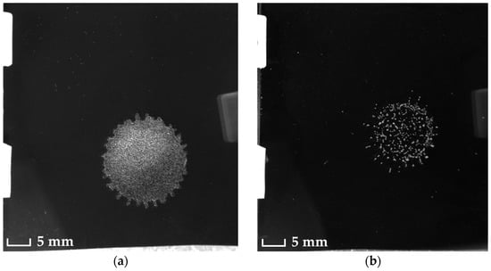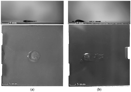 The bench-testing rig introduced in Section 2.1 was used for the impingement experiments. Suspensions with different liquid-particle type combinations (Table 2) and substrates (Table 1) were tested. The droplet speed before impact and substrate inclination angle also varied. The camera views in the top part of Figure 9 correspond to tests with a horizontal orientation of the substrate plate and a droplet generator height of 800 mm.