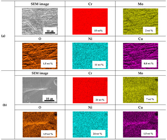 Figure 3 presents the SEM images and EDS analysis results of UNS S31603 and UNS N08367 after potentiometric polarization experiments in a green death solution at 60 °C. In both specimens, chromium, molybdenum, nickel, copper, iron, and oxygen elements were detected. The component content of each element on the surface of UNS S31603 was detected as Cr = 15 wt%, Mo = 2 wt%, O = 1.5 wt%, Ni = 11 wt%, Cu = 0.8 wt%, and Fe = 69 wt%, while that on the surface of UNS N08367 was detected as Cr = 21 wt%, Mo = 7 wt%, O = 1.9 wt%, Ni = 25 wt%, Cu = 1.5 wt%, and Fe = 44 wt%. Clearly, the contents of chromium, molybdenum, and copper, which are elements affecting corrosion resistance, in UNS N08367 are generally increased compared with those in UNS S31603. In general, a passivation oxide film in an acidic solution reacts with chromium ions (Cr3+) and oxygen ions (O2−) to form the crystal structure of chromium oxide (2Cr3+ + 3O2− → 2Cr2O3) [22]. In this research, it is believed that oxygen (O) was detected because a chromium oxide layer was formed in the two specimens.