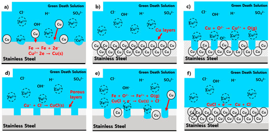 Schematic diagrams of the selective dissolution and redeposition mechanisms of stainless steel in a modified green death solution. (a) Reduction reaction of copper ion, (b) deposition of copper, (c) re-oxidation reaction of copper layer, (d) formation of copper chloride (porous film), (e) re-oxidation of substrate (Fe), (f) redeposition of copper (reduction reaction).