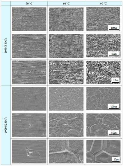 Figure 7 depicts surfaces observed using SEM after the electrochemical experiments at different temperatures. At 30 °C, UNS S31603 exhibited local pitting damage due to Cl− and SO42−. Pitting damage can mainly be attributed to Cr, Ni, and Mo, which are contained in the two types of stainless steel. Alloys containing Mo, Cr, or Ni are greatly affected by the destruction of films due to halogen ions, including Cl− [29]. The destruction of passive films by Cl− and SO42− begins locally, in areas where the films are thin and structurally uneven. In this case, the locally damaged passive film acted as an anode, while the periphery acted as a cathode, so local corrosion proceeded rapidly due to the galvanic effect. At 60 °C, corrosion grew along the grain boundary, which was relatively poor, and pitting corrosion developing in the grains was also observed. At 90 °C, intergranular corrosion and pitting corrosion developing in the grains grew further, resulting in extremely severe damage. In UNS N08367, intergranular corrosion was clearly observed. At 30 °C, pitting damage due to local corrosion was observed. At 60 °C, corrosion along the relatively poor grain boundary and shallow pitting corrosion developing in the grains were also observed. At 90 °C, local corrosion by intergranular corrosion was more clearly observed than local corrosion by intragranular corrosion.