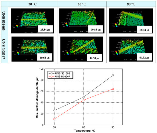 Figure 8 presents the results of the 3D microscopic analysis of the surfaces and the maximum damage depths after the electrochemical experiments at different temperatures. Overall, the damage depth increased with temperature due to the high mobility of chloride ions and sulfate ions [30]. The maximum damage depths of UNS N08367 were generally shallower than those of UNS S31603. The maximum damage depths of UNS S31603 and UNS N08367 were 25.84 and 10.61 μm, respectively, at 30 °C; 49.85 and 44.38 μm, respectively, at 60 °C; 88.34 and 64.32 μm, respectively, at 90 °C. Under the most severe corrosion condition, the maximum damage depth of UNS S31603 was approximately 1.37 times greater than that of UNS N08367. In the case of UNS S31603, the difference in maximum damage depth increased with temperature. The difference in maximum damage depth between 30 °C and 60 °C was 24.01 μm, while the difference between 60 °C and 90 °C was 38.49 μm. Conversely, in the case of UNS N08367, the difference in maximum damage depth decreased with temperature. The difference in maximum damage depth between 30 °C and 60 °C was 33.77 μm, while the difference between 60 °C and 90 °C was 19.94 µm. This is because as the temperature increased, the movements of Cr, Mo, N, O, H, and other electrons became more active. Thus, the oxygen ions in the anion-selective layer of the bipolar duplex membrane quickly moved to the metal surface, so the repassivation of the film progressed rapidly. On the other hand, the H+ ions in the cation-selective layer moved to the solution, leading to decreased activity, which resulted in shallower maximum damage depths.