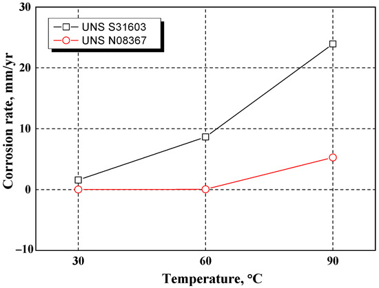 Figure 2 presents the corrosion current density values at different temperatures. In both UNS S31603 and UNS N08367, the corrosion current density increased with temperature. Therefore, it can be assumed that the dissolution reaction became active as the temperature increased. It has been reported that the corrosion current density is low at low temperatures because the surface tension and viscosity of oxide films are high [21]. The corrosion current densities (calculated using the Tafel extrapolation method) at 30 °C, 60 °C, and 90 °C were 1.48 × 10−1, 8.12 × 10−1, and 2.25 mA/cm2, respectively, for UNS S31603, and 1.15 × 10−3, 4.60 × 10−3, and 5.01 × 10−1 mA/cm2 for UNS N08367. Thus, UNS N08367 exhibited lower corrosion current densities than UNS S31603 at all temperatures and at 90 °C—the most corrosive condition—UNS S31603 had a value approximately 4.5 times higher than UNS N08367. The lower corrosion current densities of UNS N08367 are attributable to the contents of molybdenum (Mo), N, chromium (Cr), and copper (Cu), which affect passive oxide films. The higher the content, the better the stability and formation ability of passive oxide films. The Mo, Cr, N, and Cu contents of UNS N08367 were approximately 3.17, 1.23, 19, and 2 times higher, respectively, than those of UNS S31603.