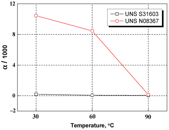 Table 3 indicates the process of calculating the α values using the corrosion rates (mm/yr) calculated based on the corrosion current densities and maximum damage depths. The obtained α values were divided by 1000. For UNS S31603, the resultant values at 30 °C, 60 °C, and 90 °C were 0.19, 0.06, and 0.04, respectively. This means that the corrosion rates according to maximum damage depth were 0.19, 0.06, and 0.04 times higher, respectively, than those obtained based on the corrosion current density. In the case of UNS N08367, the resultant values at 30 °C, 60 °C, and 90 °C were 10.45, 8.46, and 0.14, respectively.