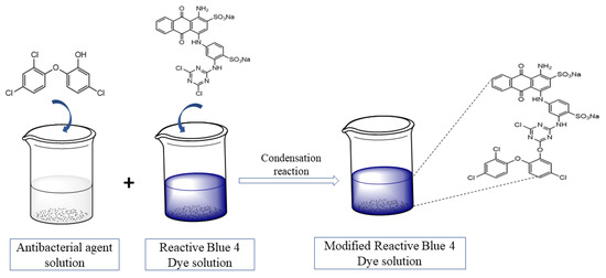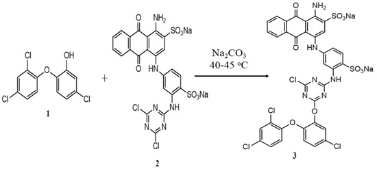 The functionalization of the Reactive Blue 4 (2) dye with triclosan (1) was carried out in a single-step reaction. An equimolar amount (20 mM) of both reactants was taken. In a round bottom flask, 13.6 g of Reactive Blue 4 dye was added and dissolved in 100 mL of distilled water (solution A). Solution A was refluxed and the temperature was maintained at 40–45 °C. In a 100 mL beaker containing 20 mL of methanol, 5.79 g of triclosan (antibacterial agent) was added and stirred (solution B). Solution B was slowly added to solution A. The pH of the solution was kept neutral, using a 3% w/v solution of sodium carbonate. The progress of the reaction was monitored using thin-layer chromatography (TLC) with an ethyl acetate and petroleum ether (70:30) solvent system. The reaction mass was stirred at 45 oC until the spot of triclosan on the TLC plate disappeared, which confirmed the successful completion of the reaction and product formation. The functionalized dye (3) was filtered and dried in an oven at 40 °C. The proposed condensation reaction showing the formation of the functionalized dye is given in Figure 1.