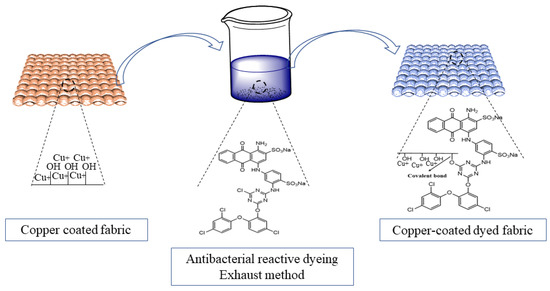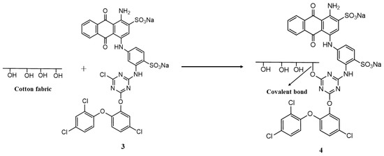 The functionalized reactive dye was applied on the copper-coated cotton fabric using the exhaust dyeing method. For this purpose, an H-T dyeing machine was used. A 3% dye shade (o.w.f) was applied on the fabric with a material-to-liquor (M:L) ratio of 1:50. The dyeing of the fabric was started at room temperature, which was gradually increased to 70–80 °C. An electrolyte (sodium sulfate, 40 g/L) and alkali (1 g/L of sodium hydroxide and 15 g/L of sodium carbonate) were added portion-wise in the dyebath at different time intervals for the proper exhaustion and fixation of the dye. The dyeing of the fabric was continued for 60 min. After that, the dyed fabric was removed from the dyebath and rinsed with tap water followed by hot water that was at 90 °C for 10 min to wash away the unfixed dye molecules from the fabric. The possible formation of covalent bonds between the chlorine atoms of the triazine reactive system of the dye and the hydroxyl groups of the cotton fabric is shown in Figure 2.