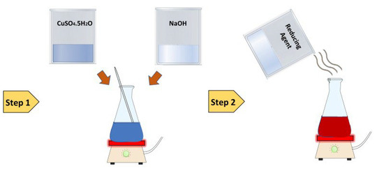 Cuprous oxide particles (Cu2O) were synthesized with combinations of two Fehling (A and B) solutions and three separate reducing agents, namely, glucose, ascorbic acid, and sodium hydrosulfite. Separate preparations of Fehling solutions A and B were made. For the preparation of Fehling A, 69.28 g of CuSO4.5H2O was dissolved in 1 L of distilled water and stirred continuously. Then, a few drops of H2SO4 were added (we added 5 drops). An amount of 350 g of sodium potassium tartrate and 140 g of NaOH were mixed in 1 L of distilled water to prepare the Fehling B solution. The Fehling A and B solutions were mixed with a 1:1 ratio. Then, a reducing agent (glucose) was immediately added to the mixed solution (2.5% of the total weight of the mixed solutions—Fehling A + Fehling B).