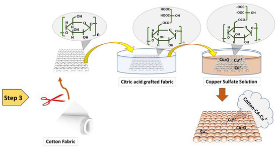 Conventionally, different natural fibers, such as bacterial cellulose [4], cellulose nanocrystals, starch, lignin, and pectin [5], have been used as bio-based materials to functionalize the textiles. However, their applications in textiles have the limitation of poor washing durability. Recently, metallic nanoparticles are increasingly being used to functionalize fabrics in an effort to prevent the transmission of disease and bacterial growth [6,7]. The researchers have been utilizing various kinds of nanoparticles for the antimicrobial finishing of hospital textiles. Among them, the nanoparticles of TiO2, Cu, ZnO, Ag, MgO, Cu2O, CuO, etc., are the most prevalent and of specific interest [8,9,10,11]. The synthesis and applications of copper nanoparticles for the development of antimicrobial textiles have attracted a lot of attention in the past few years. Various techniques, which include photochemical methods, laser ablation, chemical reduction, gamma irradiation, biological synthesis methods, etc., have been used for the synthesis of Cu-NPs [12,13,14]. Copper, its alloys, as well as copper ions have shown strong antiviral, antifungal, and antibacterial action toward a wide range of microbes. In recent years, Cu and CuO nanoparticles have garnered a lot of interest due to their potential applications as conductive inks, cooling fluids, heat transfer networks, as well as in the development of antimicrobial textiles [15].