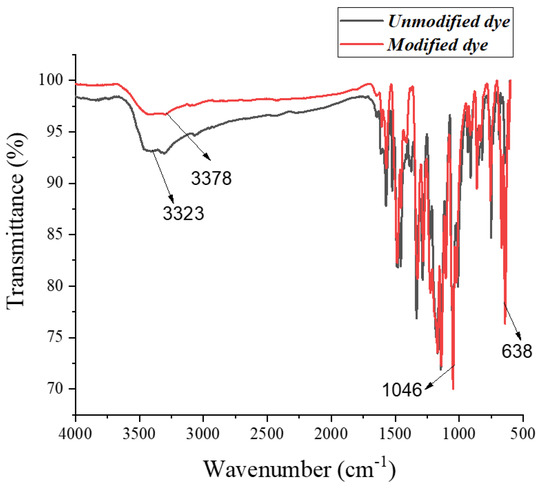 The FTIR Peaks (KBr): 3323 cm−1 (amine –NH2, –NH stretch), 3378 cm−1 (amine –NH2, N–H stretch), 1046 cm−1 (C–O–C ether linkage stretch), and 638 cm−1 (C–Cl stretch). The FTIR spectra of the unmodified dye (Reactive Blue 4) and modified dye (modified with an antibacterial agent) are shown in Figure 6. The spectra successfully confirmed that the antibacterial agent (triclosan) was successfully incorporated into the structure of the dye through covalent bonds. It was confirmed by the existence of a sharp peak of strong intensity at 1046 cm−1. This sharp peak is a characteristic peak of the ether linkages (C–O–C) [24]. The formation of a covalent bond between the hydroxyl group of triclosan and chlorine of the triazine ring resulted in the development of an ether linkage (C–O–C). Therefore, the absence of a sharp and strong peak at 1046 cm−1 in the spectrum of the unmodified dye and the appearance of this peak in the spectrum of the modified dye confirmed that the modification of the dye with an antibacterial agent was successfully achieved [25,26].