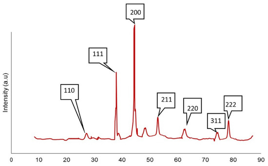 The XRD analysis was conducted to determine the phase composition of the deposition of cuprous oxide particles. Figure 8 illustrates the XRD spectrum of the fabric sample in a 2θ range of 10–80 degrees with a 0.02-degree shift. The precise identification of all the diffraction signals from the cuprous oxide structure reveals the phase purity of the produced cuprous oxide nanoparticles. The reflections that were represented by the diffraction peaks at 2θ of 29.6°, 36.5°, 42.4°, 52.1°, 61.5°, and 73.7° were (1 1 0), (1 1 1), (2 0 0), (2 1 1), (2 2 0), and (3 1 1), respectively [30,31]. The sharpness of the signals validated the crystalline character of the cuprous oxide nanoparticles; however, the broadening of the signals supported the production of nanosized cuprous oxide particles. As such, no characteristic peaks of impurities were detected, except the peak of the copper oxide phase at 2θ of 38° [32,33].