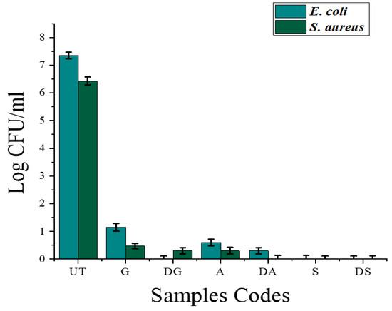 For more clarification, the reductions in the colony forming units (CFUs/mL) of the surviving bacterial colonies were calculated, and the obtained results are presented in Figure 11. The untreated cotton fabric exhibited a substantial number of surviving bacterial colonies, and higher values of CFUs/mL were obtained (7.34 for E. coli and 6.44 for the S. aureus bacterial strain). The results revealed that the CFUs concentration was remarkably reduced in all the treated samples. The samples S and DS exhibited the highest reductions in surviving bacterial colonies, and the CFU values reached 0 from 7.34 and 6.44 for E. coli and S. aureus, respectively.