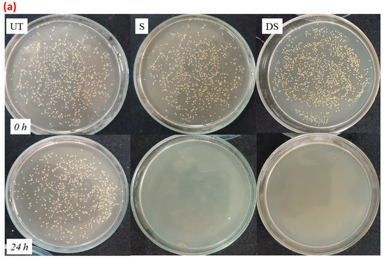 (a): images for the number of bacterial colonies that were inoculated (0 h) and survived (24 h) for samples UT, S, and DS against S. aureus. (b): images for the number of bacterial colonies that were inoculated (0 h) and survived (24 h) for samples UT, S, and DS against E. coli.