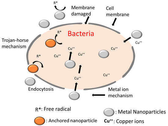 A simple overview of the mechanisms involved in the antimicrobial actions of metal nanoparticles, including catalyzed reactive species, metal ion discharge, and the “Trojan horse effect” caused by endocytosis mechanisms [21].