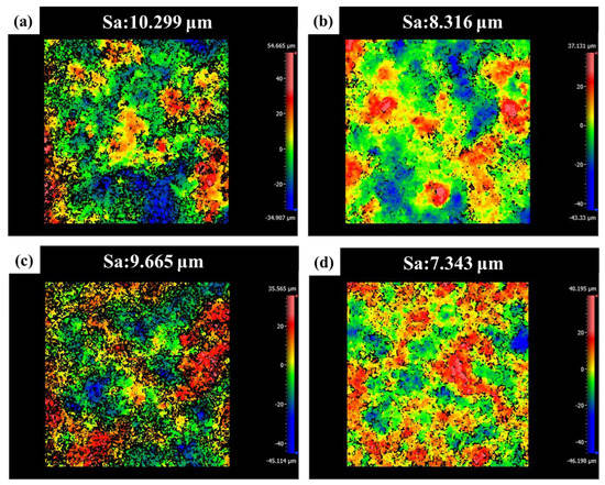 Figure 2 presents the 3D morphologies and surface roughness of the coatings prepared using different voltages, and the coating area selected for different test samples was 834.370 μm × 834.370 μm. There was no obvious trend observed regarding the influence of voltage on the surface roughness, but it is undeniable that the coating prepared at a low voltage was coarsest, while the surface roughness of the coating prepared at a high voltage was smallest. The surface roughness of the coating prepared at 360 V voltage was 10.299 μm, and the surface roughness of the coating prepared at 450 V voltage was 7.343 μm, which represents a large difference in roughness. The measurement results of the coatings surface roughness were consistent with those observed in Figure 1. The temperature of the micro-arc discharge area rose rapidly at higher working voltages, resulting in the formation of more molten oxides, which plays a role in repairing and leveling the coating.