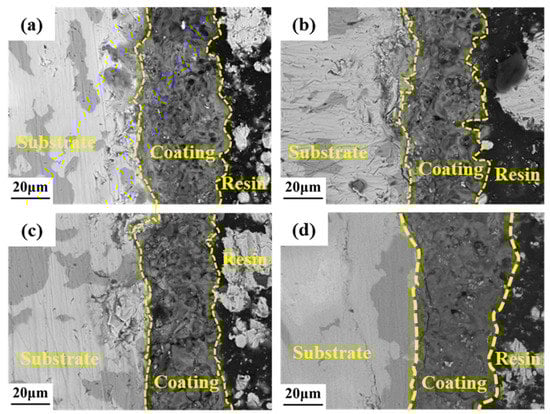 Cross-sectional morphologies of coatings prepared using different voltages: (a) 360 V, (b) 390 V, (c) 420 V, and (d) 450 V.