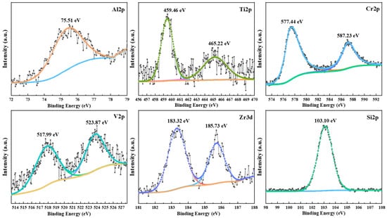 The XPS high-resolution spectrum of each element on the coating prepared at 420 V is shown in Figure 5. There was only one peak in the Al2p spectrum, corresponding to a binding energy of 75.51 eV, indicating that the predominant form of Al present was Al2O3 [22]. The binding energies corresponding to the two peaks of Ti2p were 459.46 eV and 465.22 eV, indicating that Ti was present in the coating in the form of TiO2 [23]. From the high-resolution spectrum of Cr2p, it can be seen that the binding of Cr2p had two peaks at 577.44 eV and 587.23 eV, corresponding to the Cr–O bond, representing Cr2O3 [10]. The peaks in the V2p spectrum were 517.99 eV and 523.87 eV, corresponding to the V–O bond, representing V2O5 [24]. The high-resolution spectrum of Zr3d showed that it had two peaks, corresponding to binding energies of 183.32 eV and 185.73 eV, and the surface Zr present in the coating was ZrO2 [25]. The peak of the Si2p spectrum was 103.10 eV, indicating that the Si present in the coating was SiO2 [26].