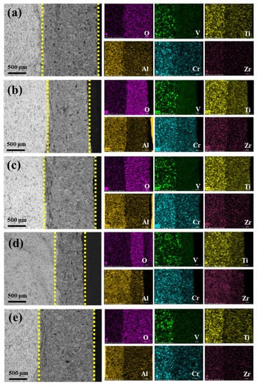 The EDS results showed that the O element was enriched in the diffusion layer, and uncoated samples had a high content in the diffusion layer and a large amount inside the matrix, which indicates that the MAO coating hinders the diffusion of O elements to the inside of the matrix to a certain extent. In addition, the content of Ti, Al, Cr, and Zr elements in the diffusion layer after high-temperature oxidation of the MAO sample was lower than that of the matrix. The content of element V in the diffusion layer is always very low, because the V2O5 formed after oxidation is extremely volatile at 800 °C, resulting in a very low content of V elements and creating holes in the diffusion layer.