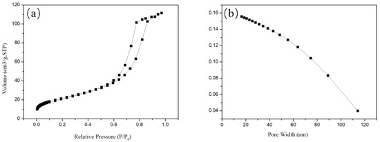 Figure 1 presents the results of the BET test of the TiO2/CNT/CQD nanocomposites. The surface area of TiO2/CNT/CQD is as high as 78.07 m2/g and the pore width range is 10–120 nm, indicating that an ultrasonic radiation treatment is a useful technique to prepare mesoporous materials [36,37,38,39]. Bai has reported that the surface area of the TiO2/CNT mesoporous composite material is 42.90 m2/g [40]. Therefore, the doping of CQD is beneficial to increase the surface of the TiO2/CNT/CQD nanocomposites. It attributes to the small particle size.