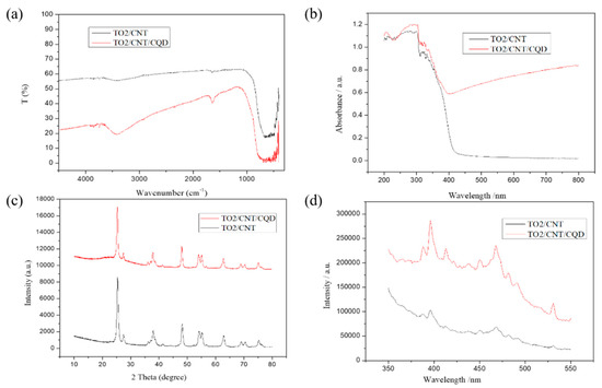 (a) FT-IR spectra, (b) UV–vis, (c) XRD patterns, and (d) photoluminescence spectra of TiO2/CNT and TiO2/CNT/CQD mesoporous composites.