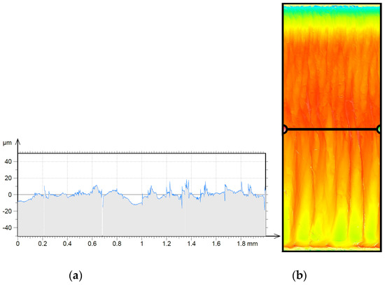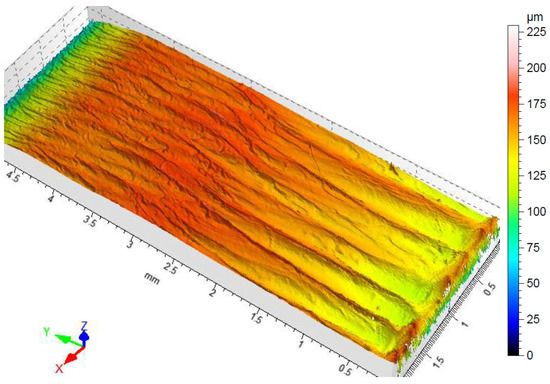 The raw data are shown in Figure 1. In the first step, artefacts were removed from the image, resulting, for example, from an incorrect measurement at a given point by assigning a threshold value. The image of the sample after this operation is shown in Figure 2. Then, the surface was levelled (Figure 3). The last stage in processing the stereometric data was the calculation of the roughness and 3D and 2D profile parameters of the test object. The 2D profile parameters are shown in Table 4 and Figure 4.